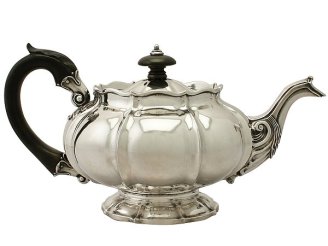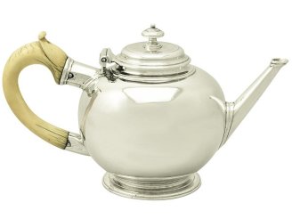 The first silver service Teapots were not designed and made until 1730. Simple globular shaped designs appeared first and followed by straight-sided silver teapots, then the oval-shaped teapots of the 1770s made famous by The American patriot Paul Revere. By the 1780’s footed teapots appeared, designed to protect tabletops from heat scarring.