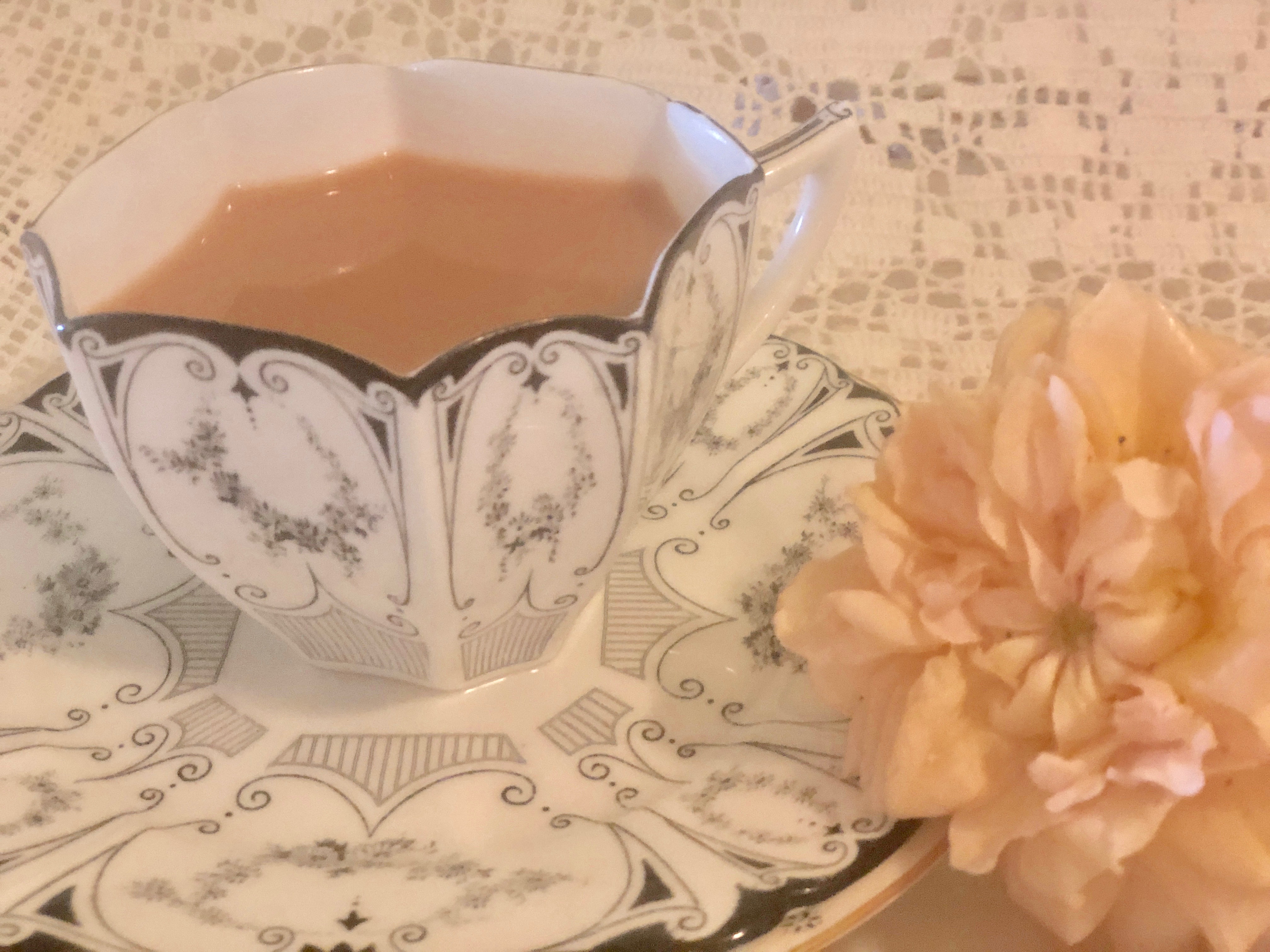The softer photos above were taken just now as I took a break from writing and made hot, light scones ( if I say so myself), accompanied by piping hot tea served on a white lace cloth and tray. The Cup, Saucer and Plate is a delicate Shelley 1920’s Black and White set. This was probably the best cup of tea we have shared in the last three months due mostly to using such delicate china cups and appreciating the ability to be inside on a cold, rainy day. I can make tea whenever I want. Tea does taste better in vintage, bone china cups, for sure.