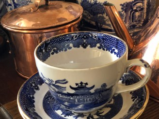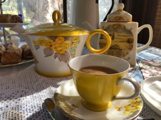The Burleigh traditional willow pattern large cups above we often use for breakfast Tea. An antique Shelley tea set for afternoon tea and a delicate trio for green tea with lunch not every day but a few times a week. I have set up a kitchen cupboard with a yellow tea set and a new (vintage) cute Teapot ready for use at any time. There is a tray table with a silver teapot and trios of fine china, and the dresser in the hall is laden with vintage china – a display to inspire and uplift the soul when walking past. And it does just that.